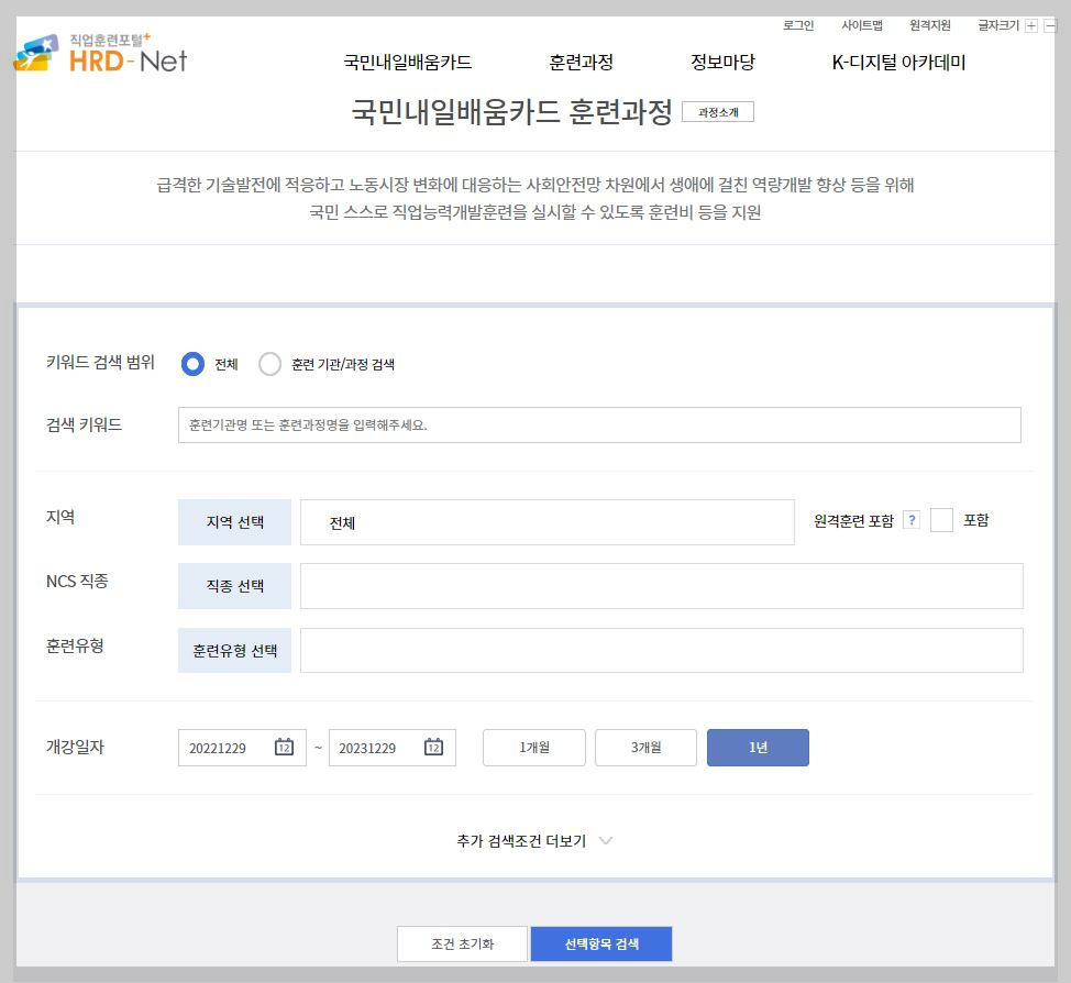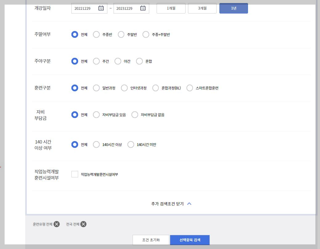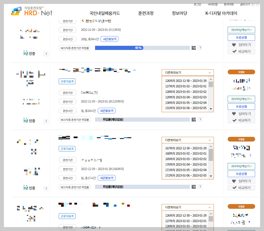 3. 아래와 같이 선택하신 조건에 맞는 훈련 과정을 확인해보실 수 있습니다.